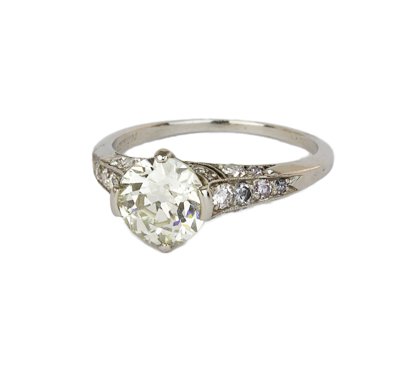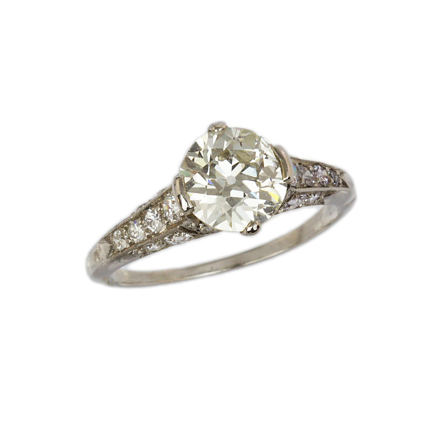 Platinum ring with a 1.36 carat old European cut center diamond (SI3 clarity/J-K color), the 28 old European cut accent diamonds amount to approximately 0.44 carat TW (VS1-SI3 clarity/F-G color), making a total carat weight of 1.80. Measures 8mm wide across the top, fits a size 5.75 finger, and weighs 3.2 grams.