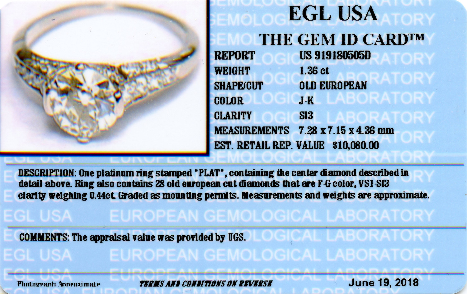 EGL cert # 919180505D is included in the sale.