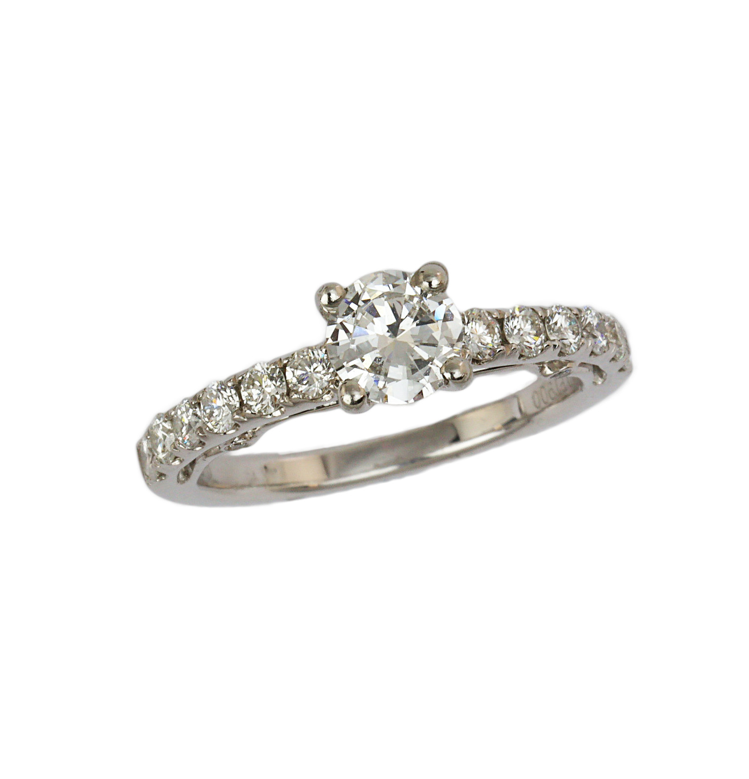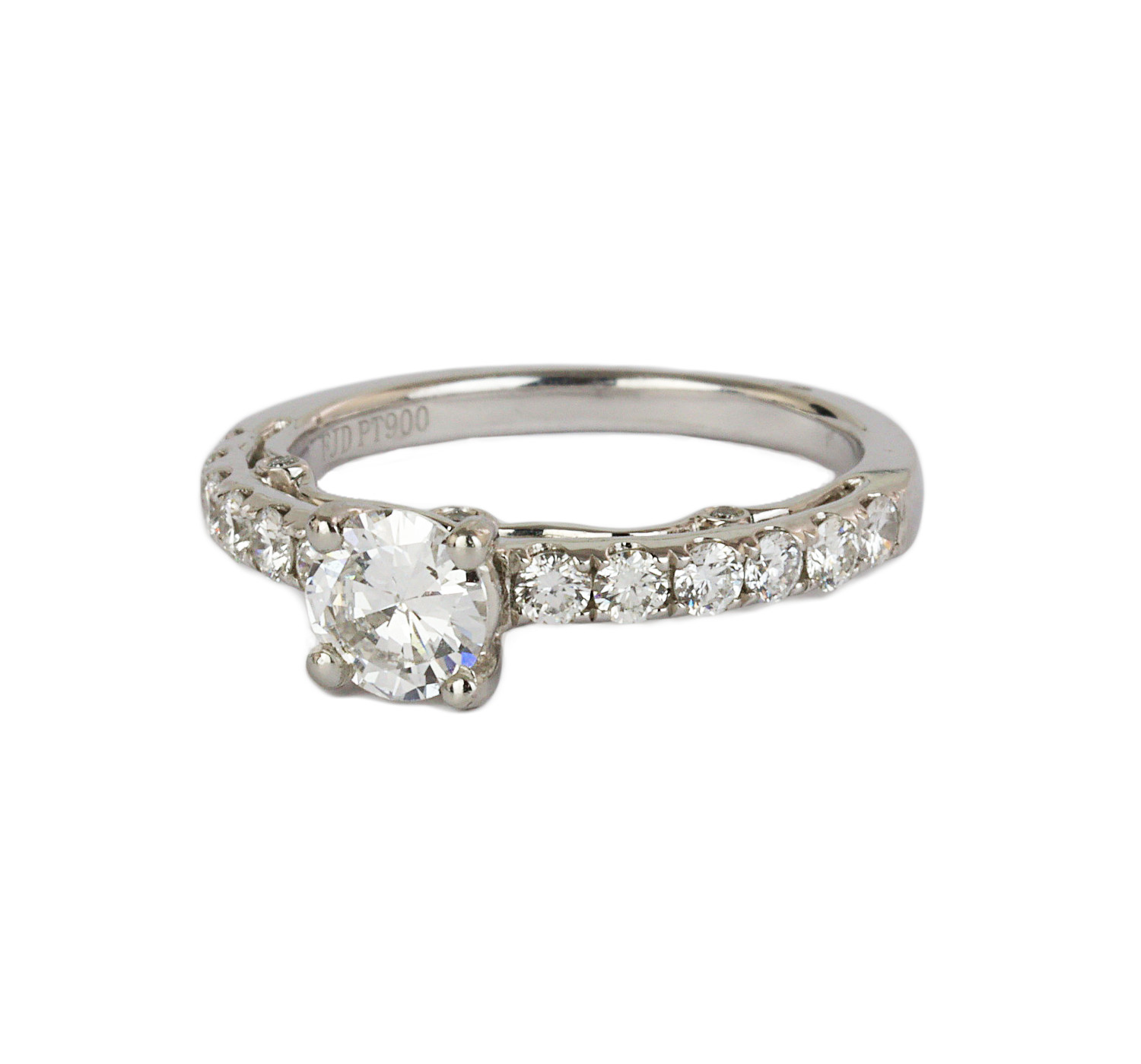 Platinum ring with a 0.58 carat round brilliant cut center diamond (VS2 clarity/F-G color) and 18 round brilliant cut accent diamonds which amount to approximately 0.39 carat TW (VS2-SI1 clarity/F-G color). Making the total carat weight 0.97. Measures 6mm wide across the top, fits a size 5.75 finger, and weighs 5.1 grams.