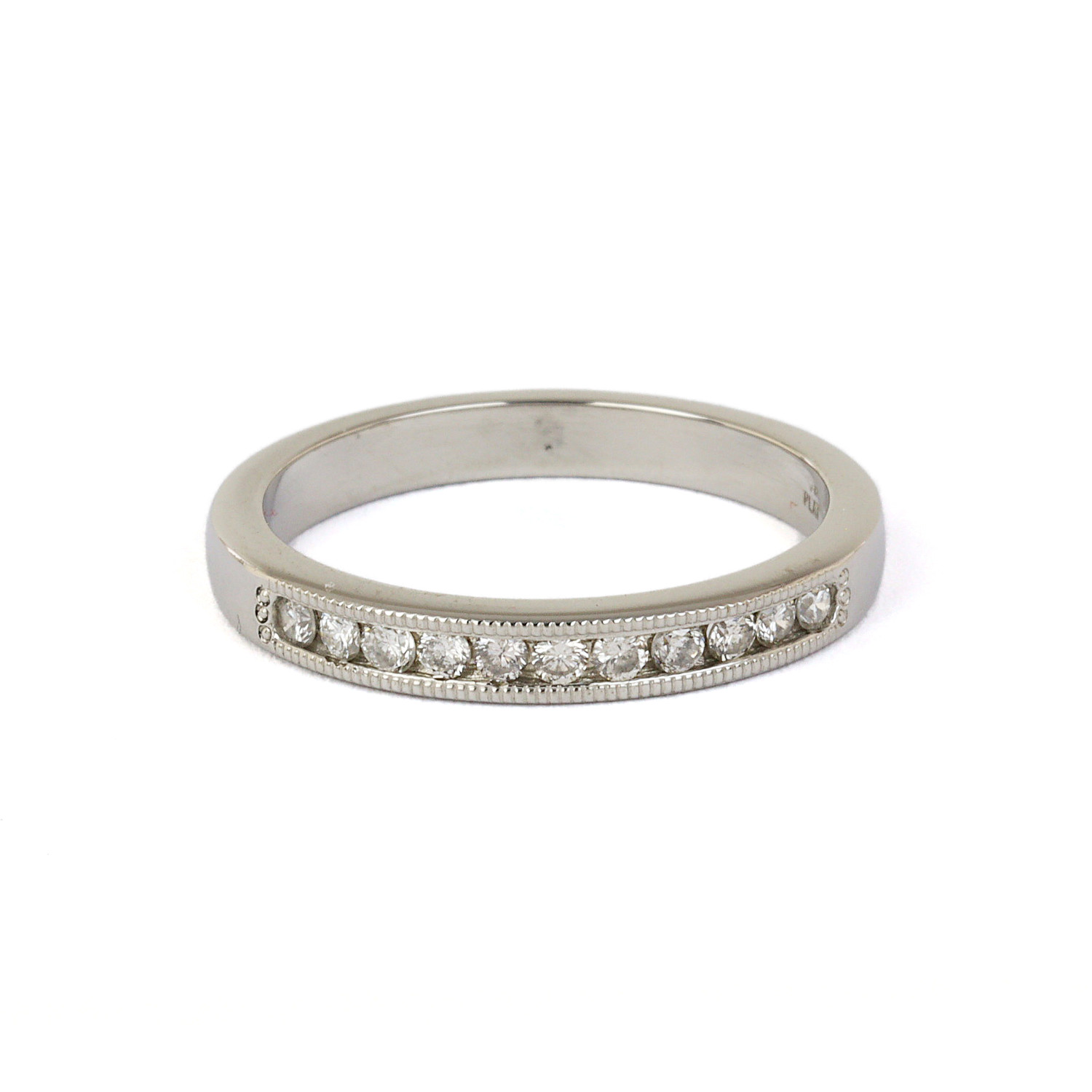 Platinum ring with milgrain edges and diamonds which amount to approximately 0.15 carat TW (SI-I clarity/H-I color). Fits a size 7 finger, measures 3mm wide, and weighs 5.0 grams.