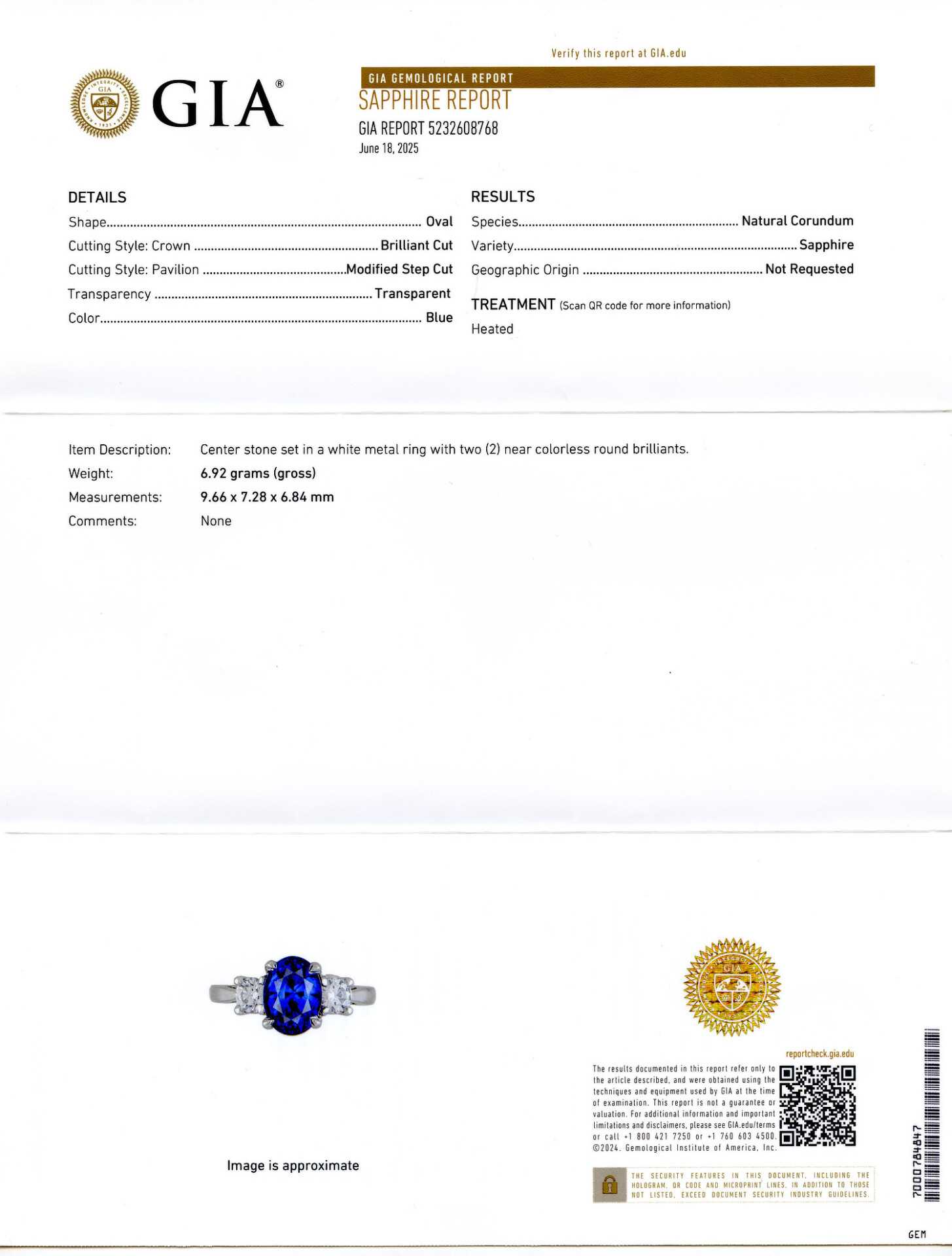 Platinum ring with a 9.66mm diameter sapphire stone. Fits a size 6.75 finger, measures 7.28mm wide across the top, and weighs 6.92 grams. The band has approximately 0.60 tdw sides (VS1/G-H-I). GIA Certificate #5232608768 is included in the sale.