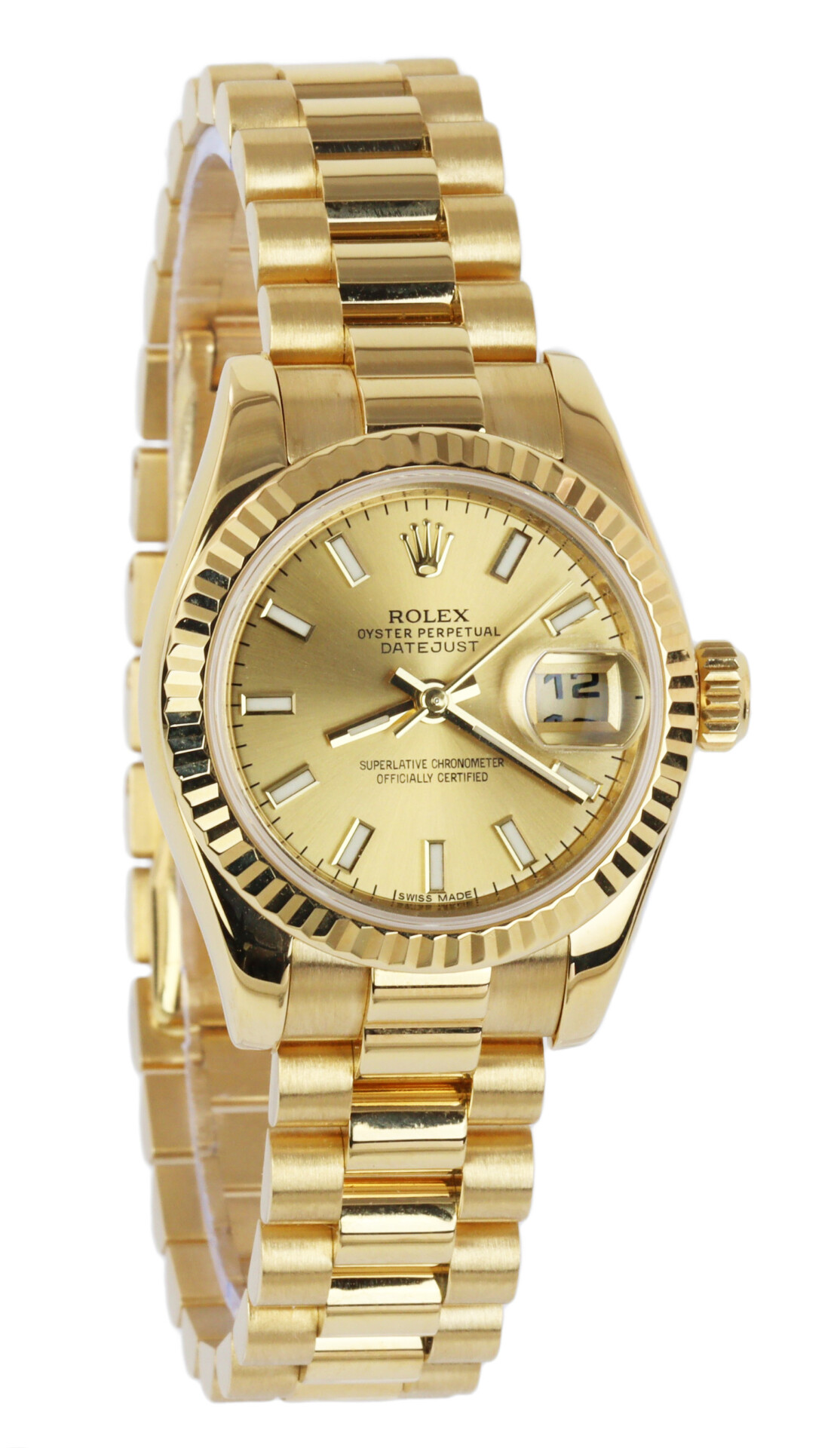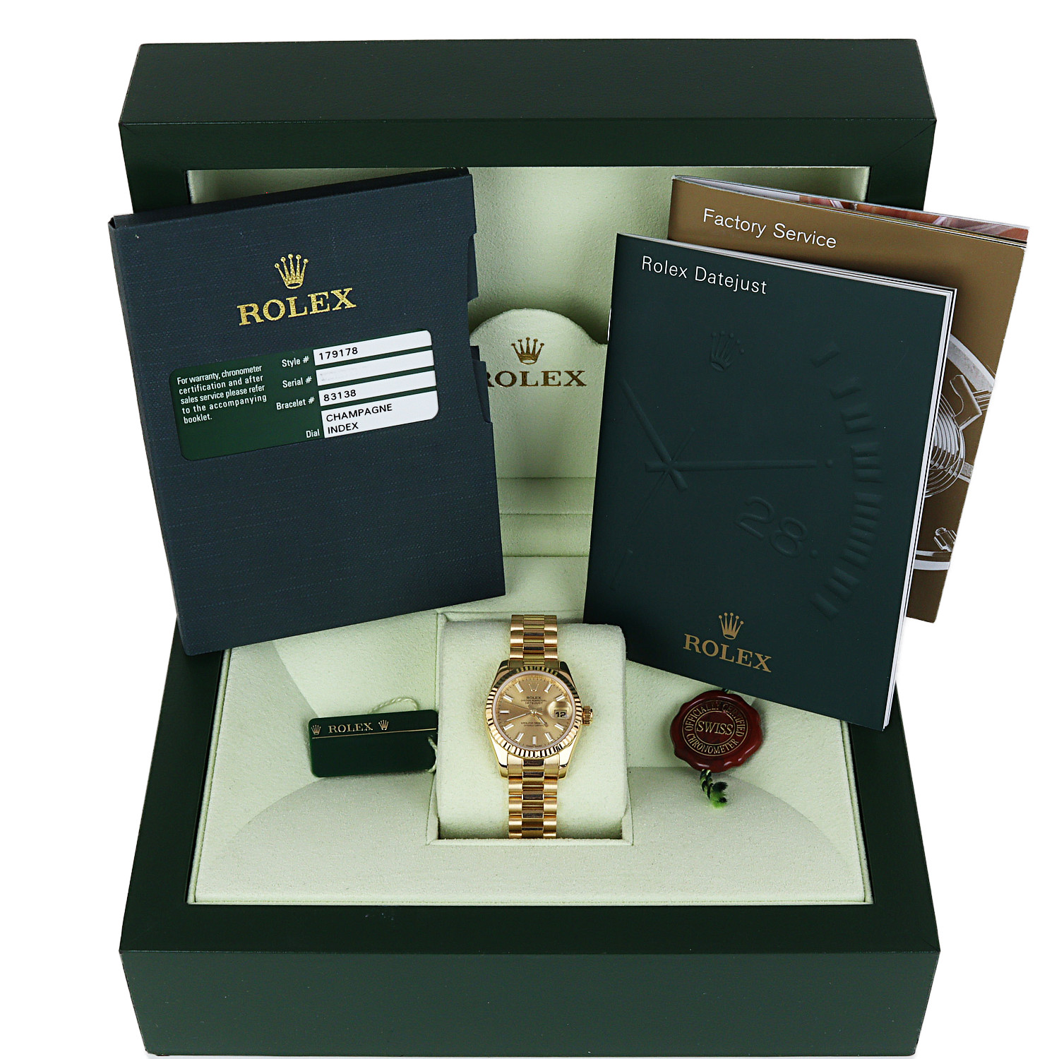 Rolex women’s 18k yellow gold Datejust V014863 wristwatch. It has a 26mm case, the band is set to fit a 6 3/4″ wrist, was made circa 2008-2009, and comes with the pictured box and documents.