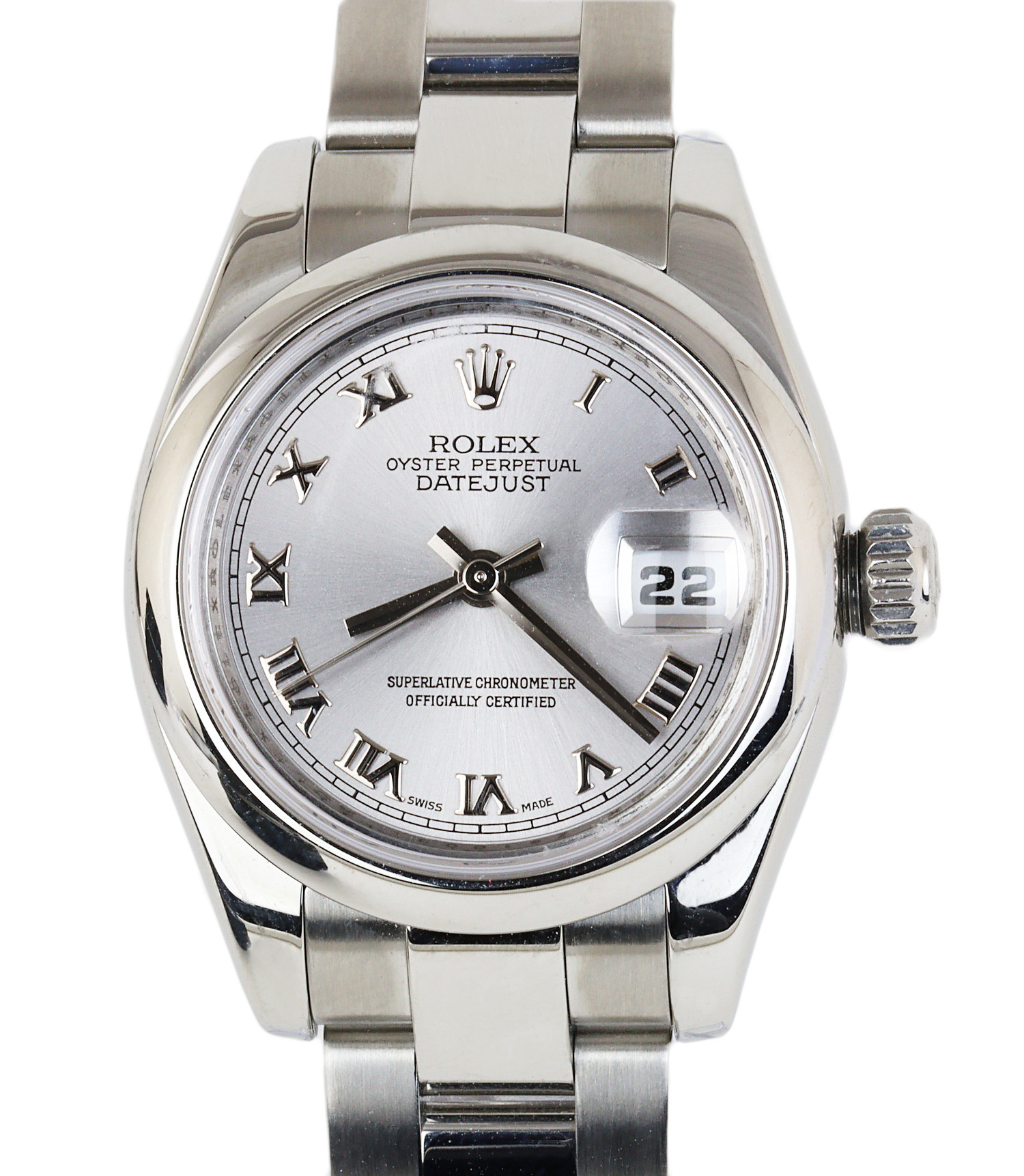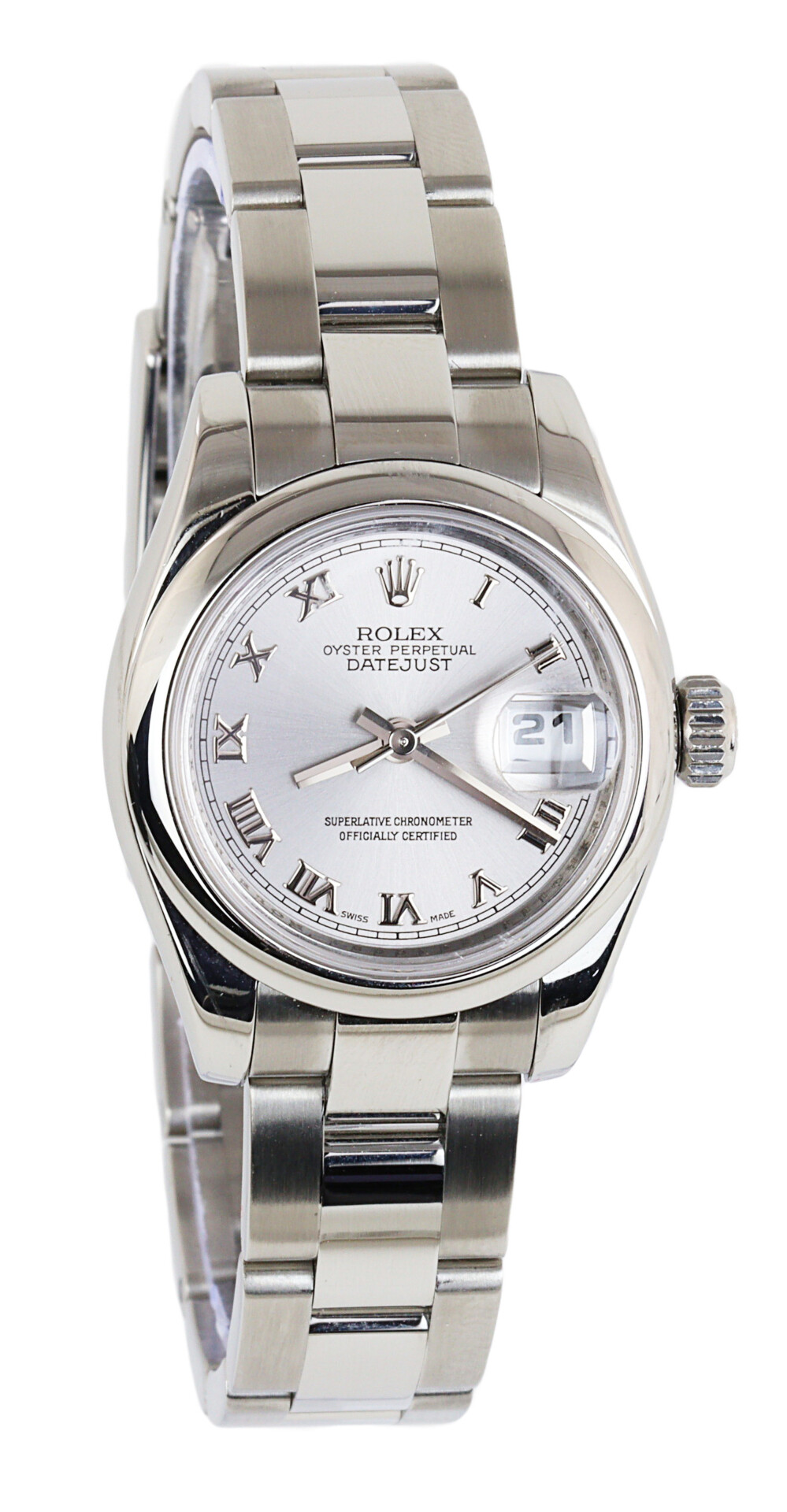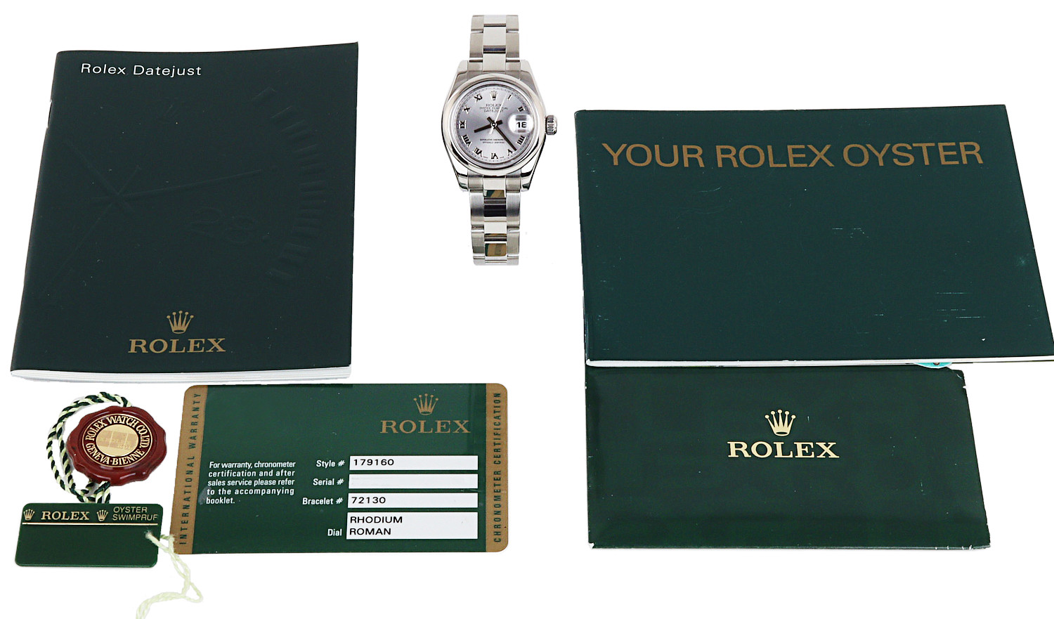 Rolex women’s stainless steel Oyster Perpetual Datejust 179160 wristwatch. Featuring a Rhodium Roman dial. Made circa 2006-2008. Documents are included in the sale. No box.