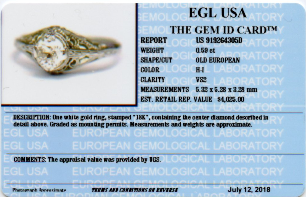 Vintage 18k white gold ring with a single 0.59 carat diamond (VS2 clarity/H-I color). Fits a size 6.75 finger, measures 8mm wide across the top, and weighs 2.9 grams. EGL cert # US919264305D is included in the sale.