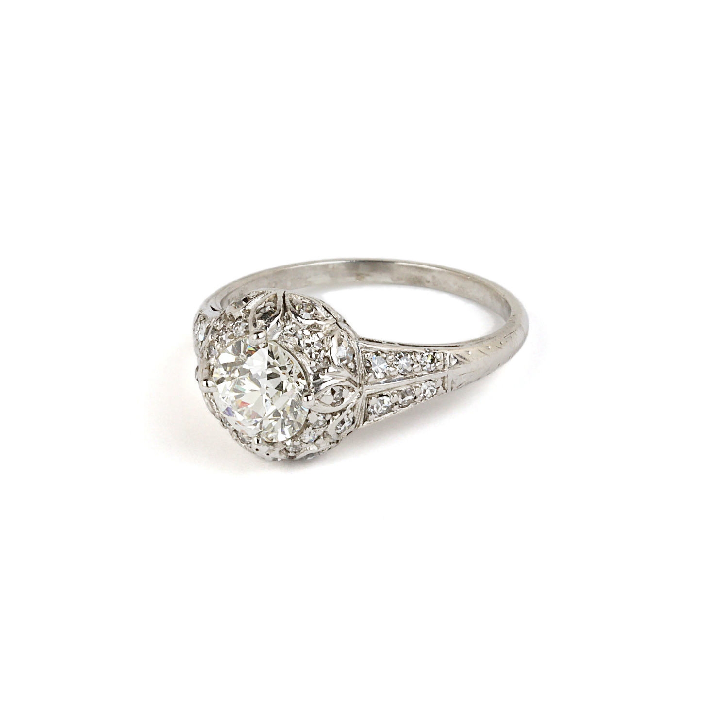Vintage platinum ring with a 0.94 carat old European cut center stone (SI2 clarity/H color), and approximately 0.20 carat TW of accent diamonds. Fits a size 5.75 finger, measures 9.5mm wide across the top, and weighs 3.7 grams. EGL cert # US912758905D.